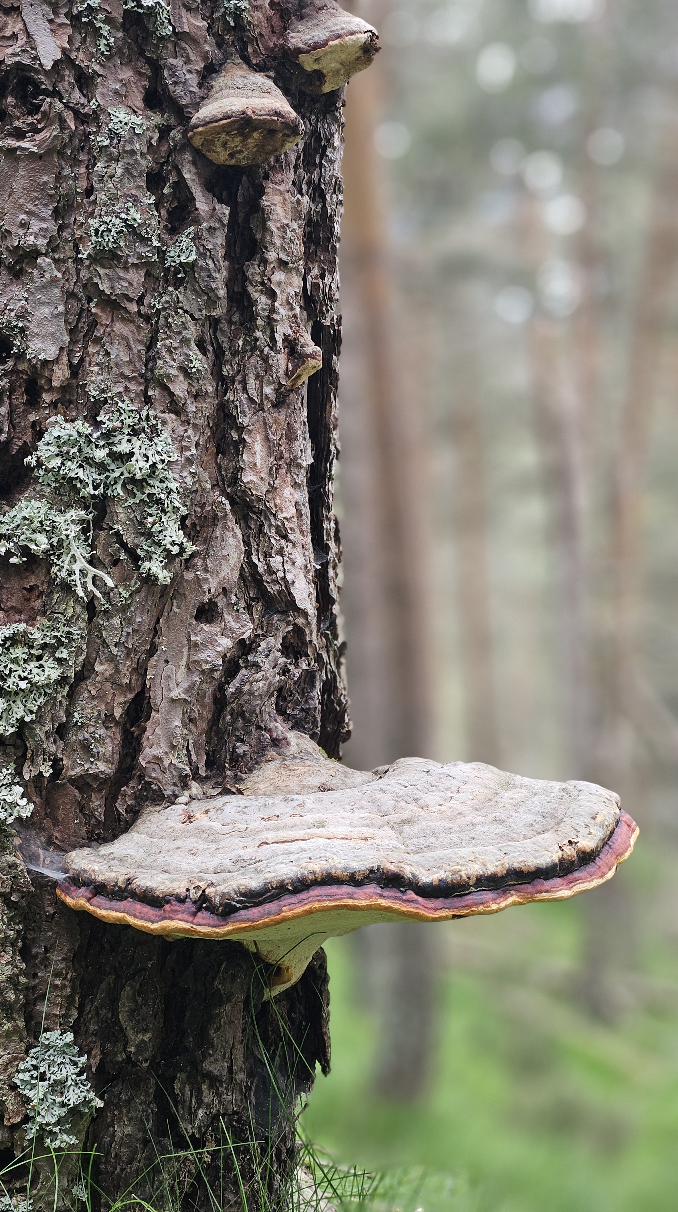 Gyromitra esculenta. Fomitopsis pinicola. Arándano. Orchis ustulata.