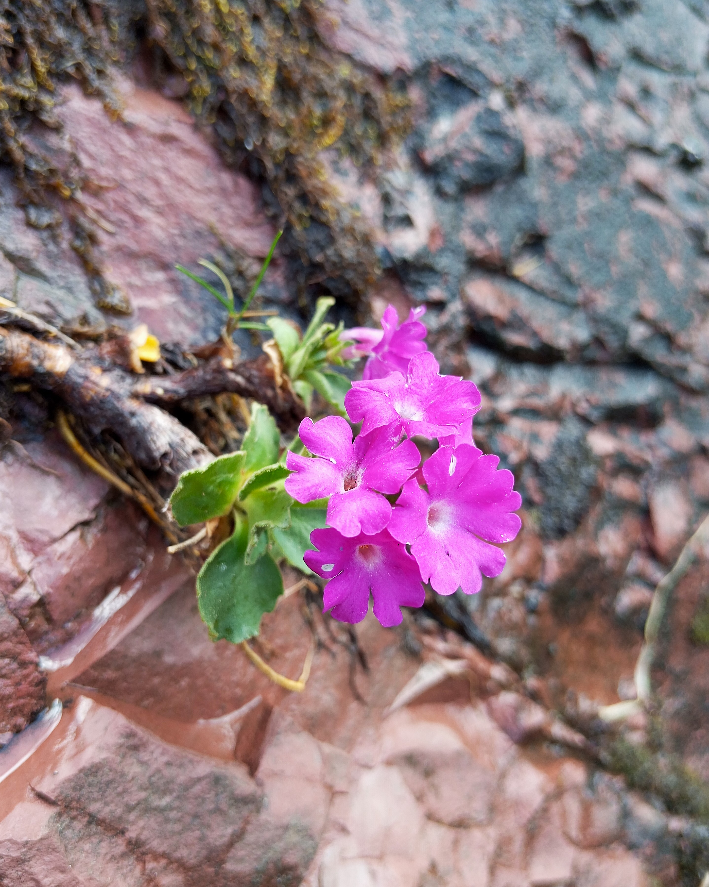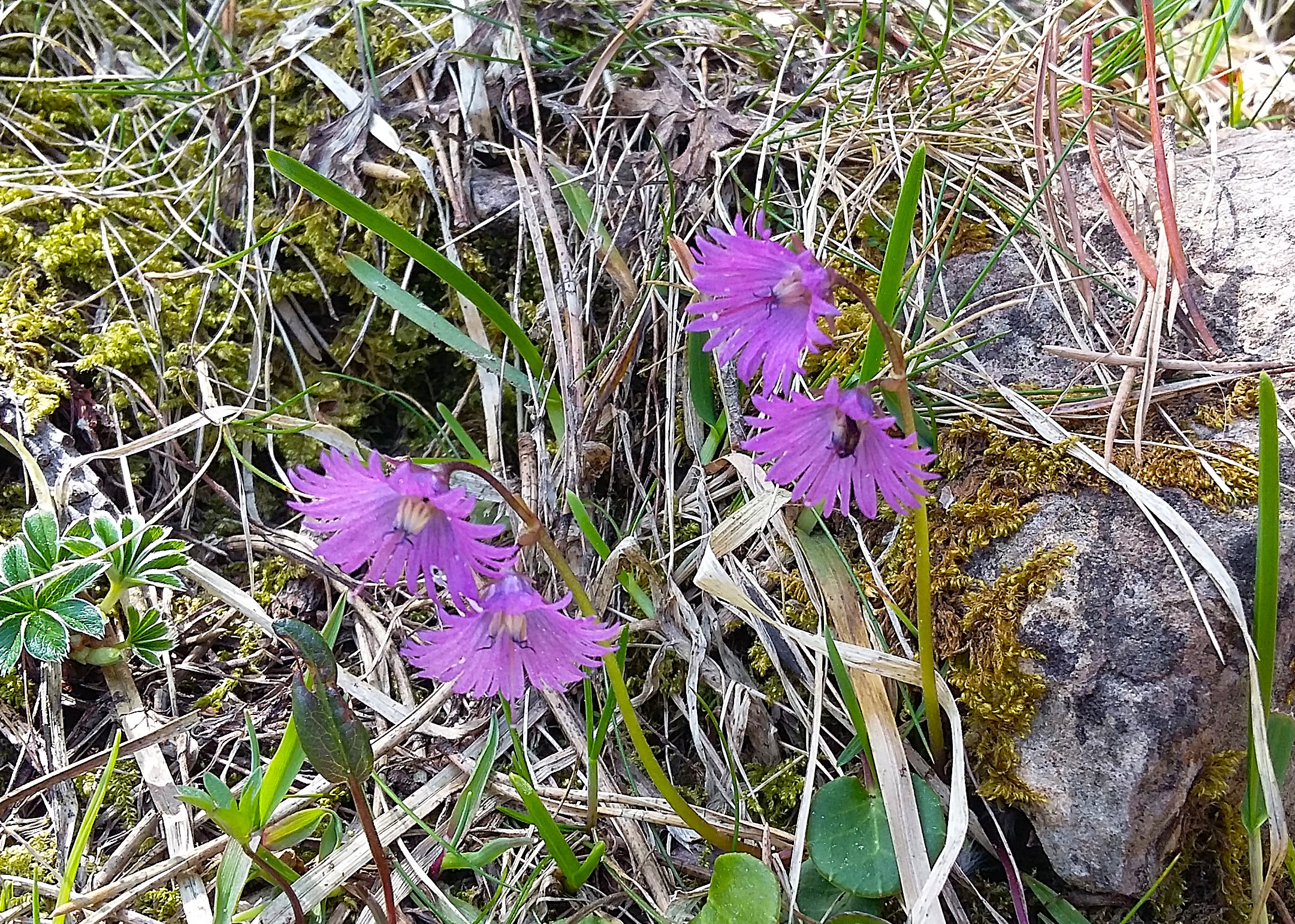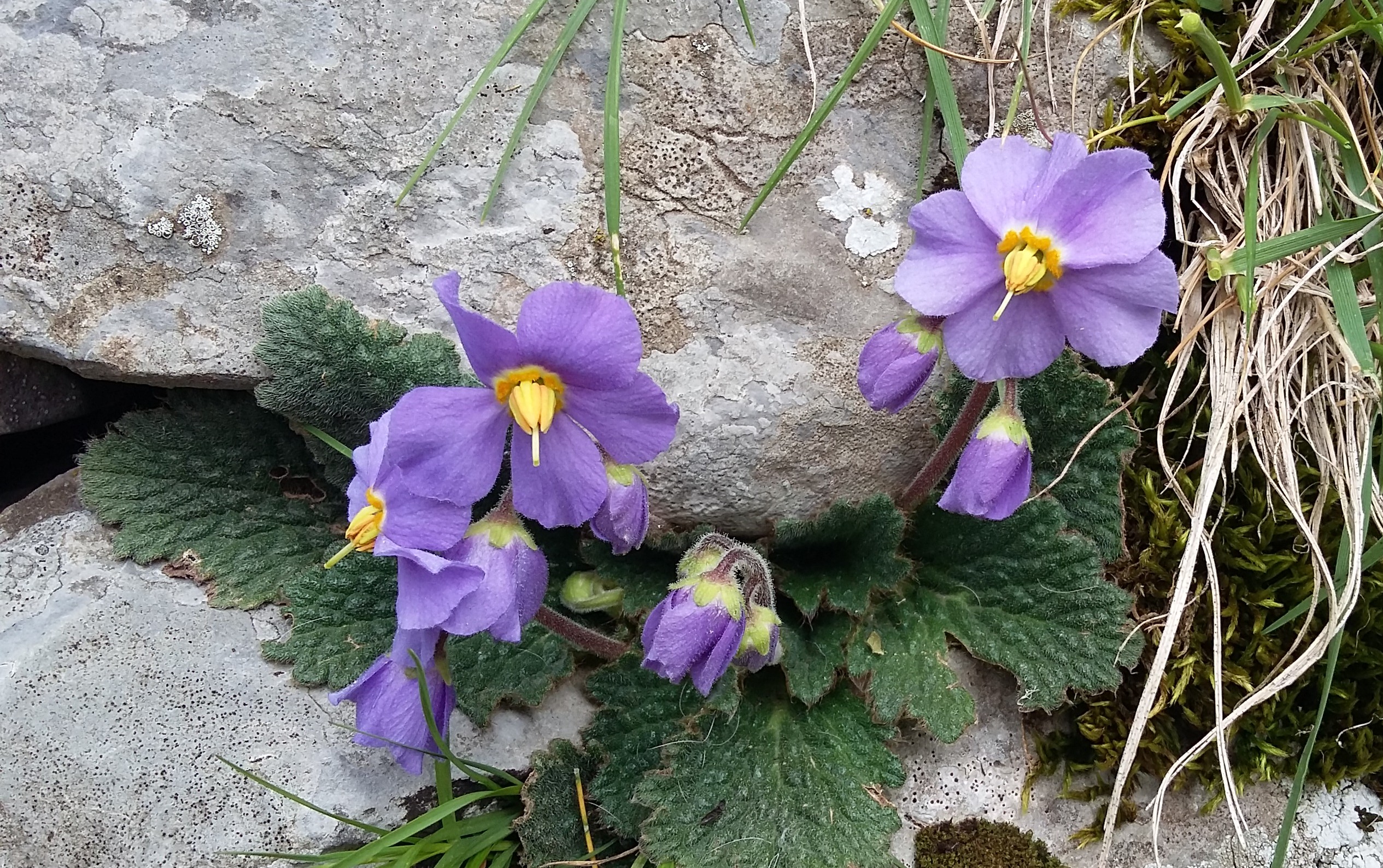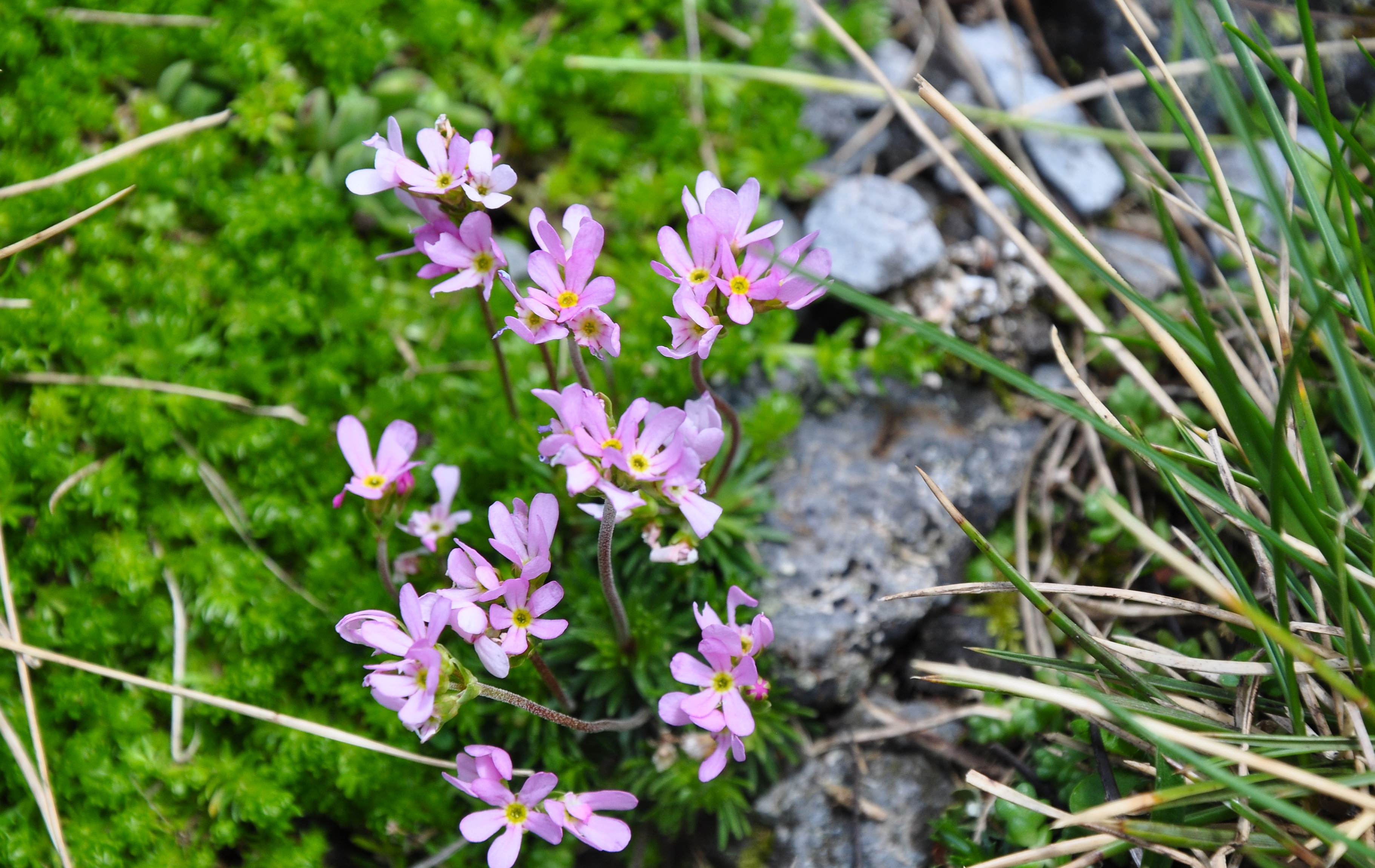 El valle colgado de los Ibones del Anayet es uno de los parajes más encantadores del Pirineo. El intenso azul de la genciana se hace notar en la amplia pradera. En el lugar identificamos las especies: Primula hirsuta, Primula farinosa, Androsace laggeri y Androsace vitaliana.
