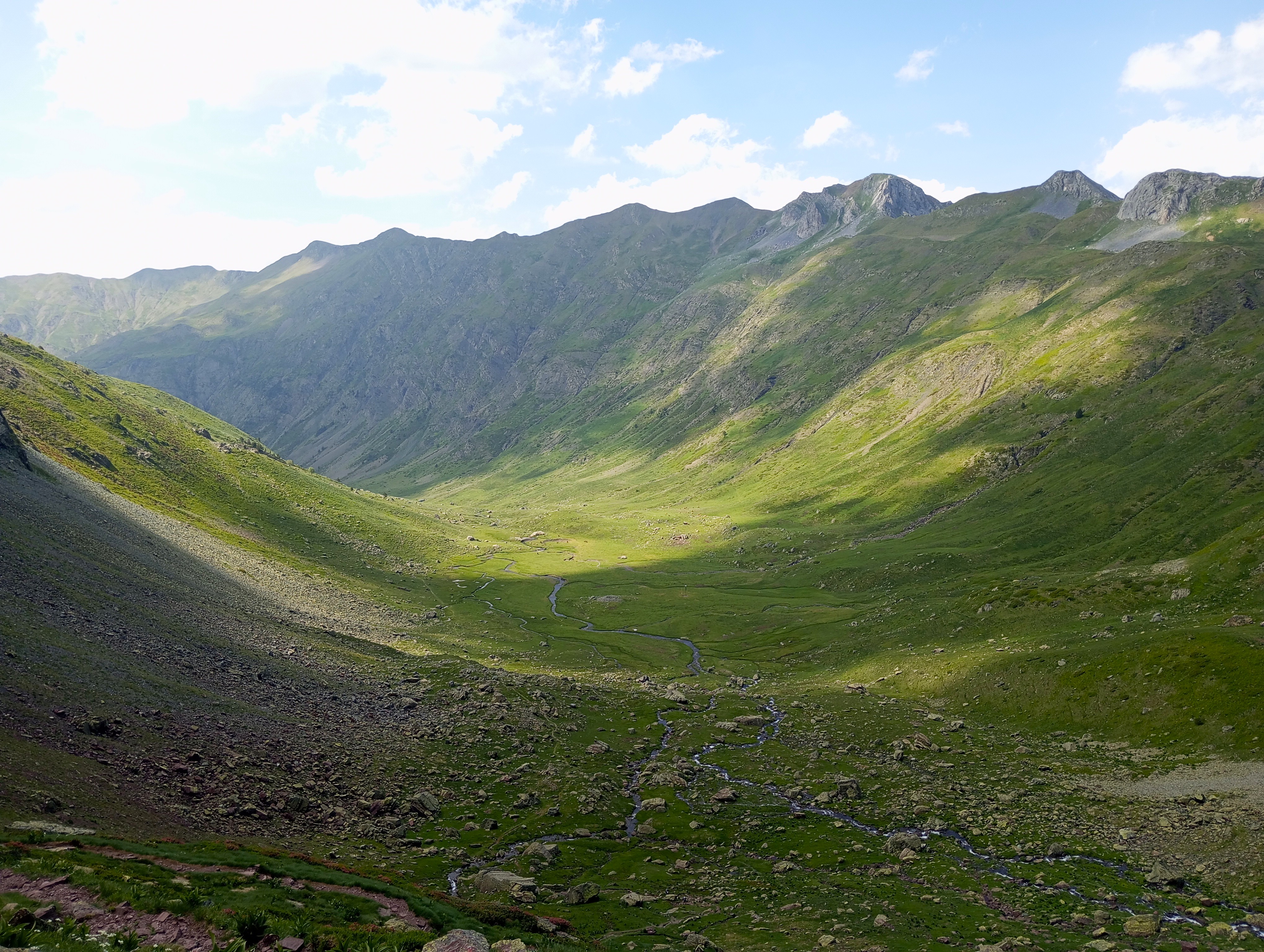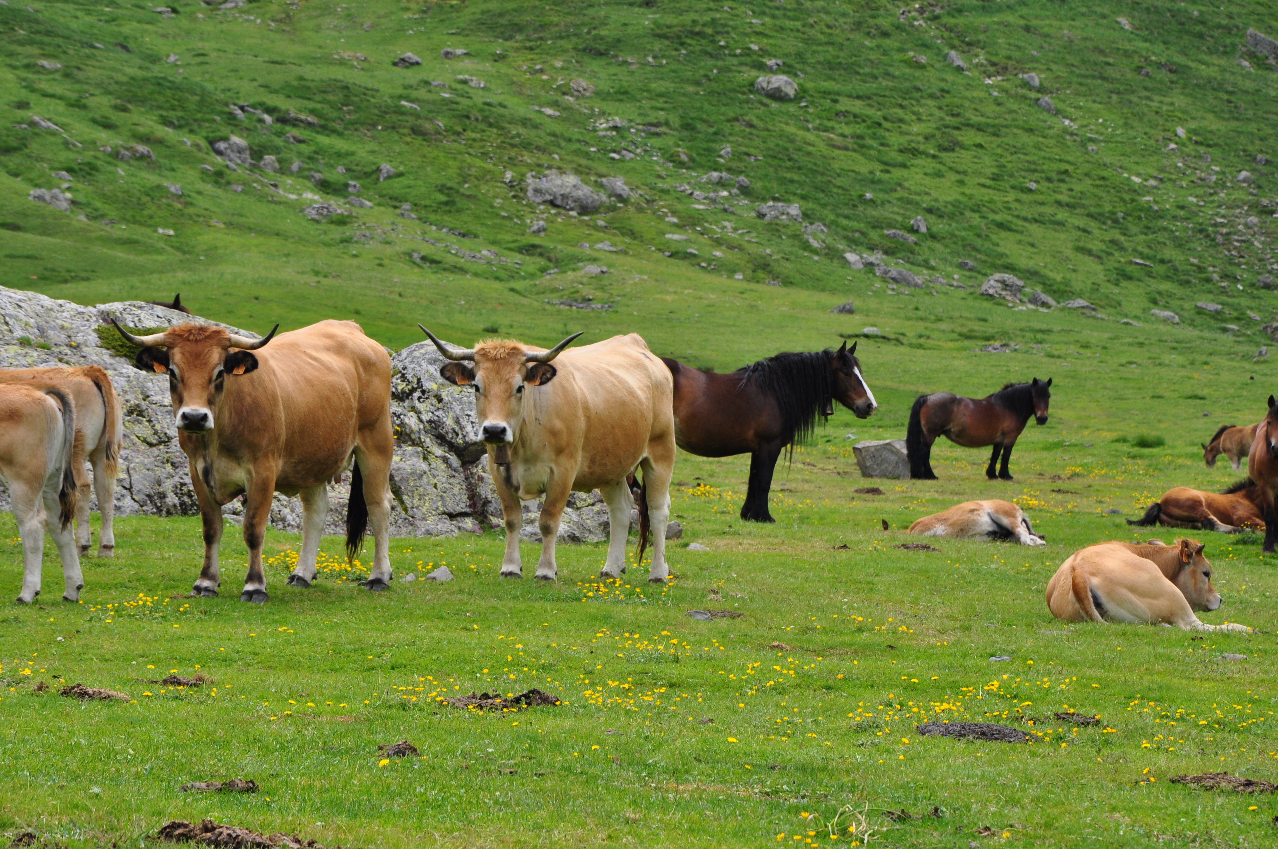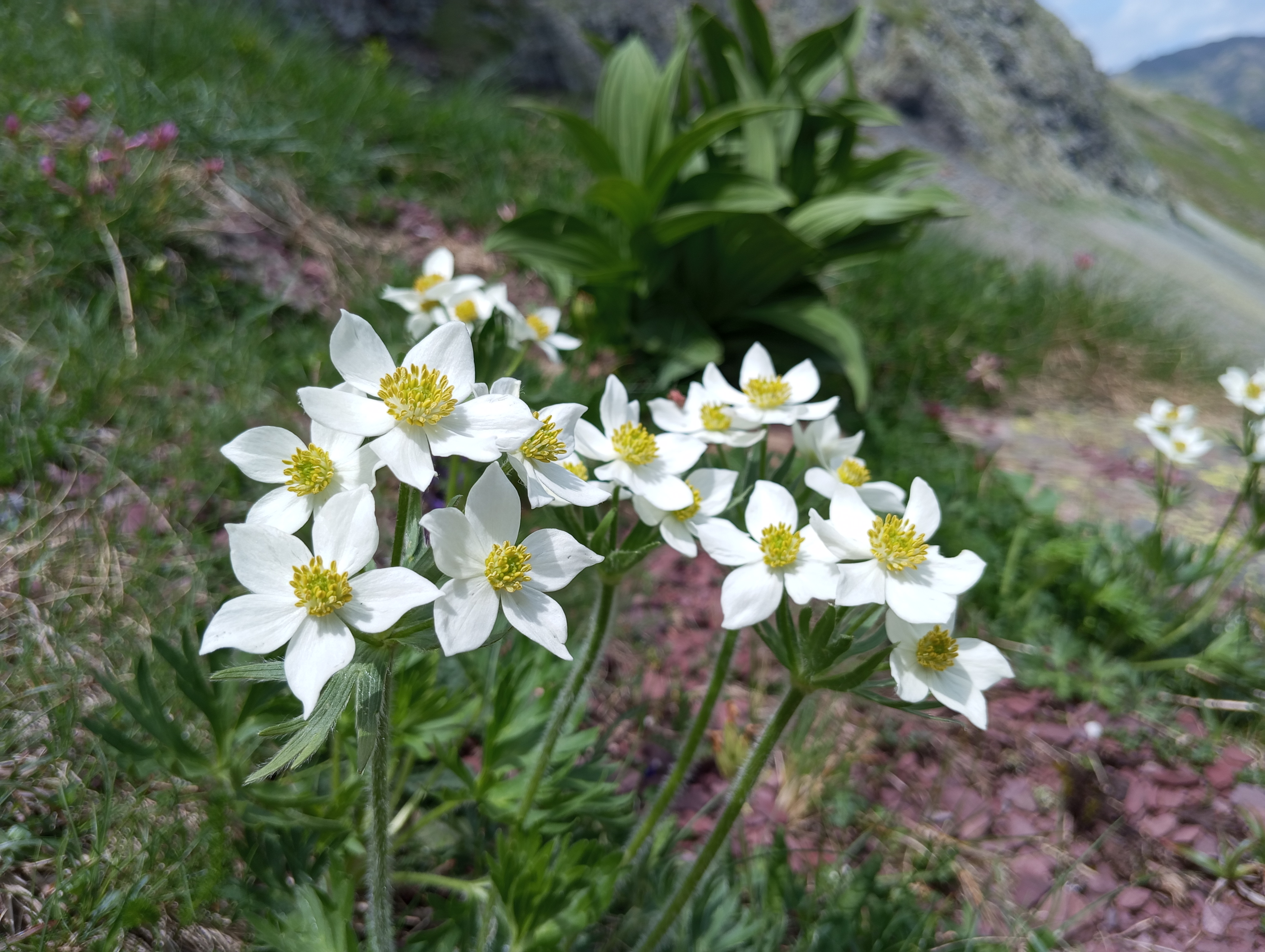 Abundan las arandaneras (anayón es el término aragonés utilizado para referirse a los arándanos). Y las marmotas. Sorprendemos a un pequeño grupo de sarrios. Un rebaño de vacas Aubrac francesas pasta en el ya ancho valle. Una vez alcanzada La Rinconada es preciso superar el desnivel que nos separa del circo glaciar. Corre el agua y el gigantesco escalón está densamente poblado de Anemone narcissiflora, Horminum pyrenaicum y Caltha palustris. Hay vedegambre por doquier.