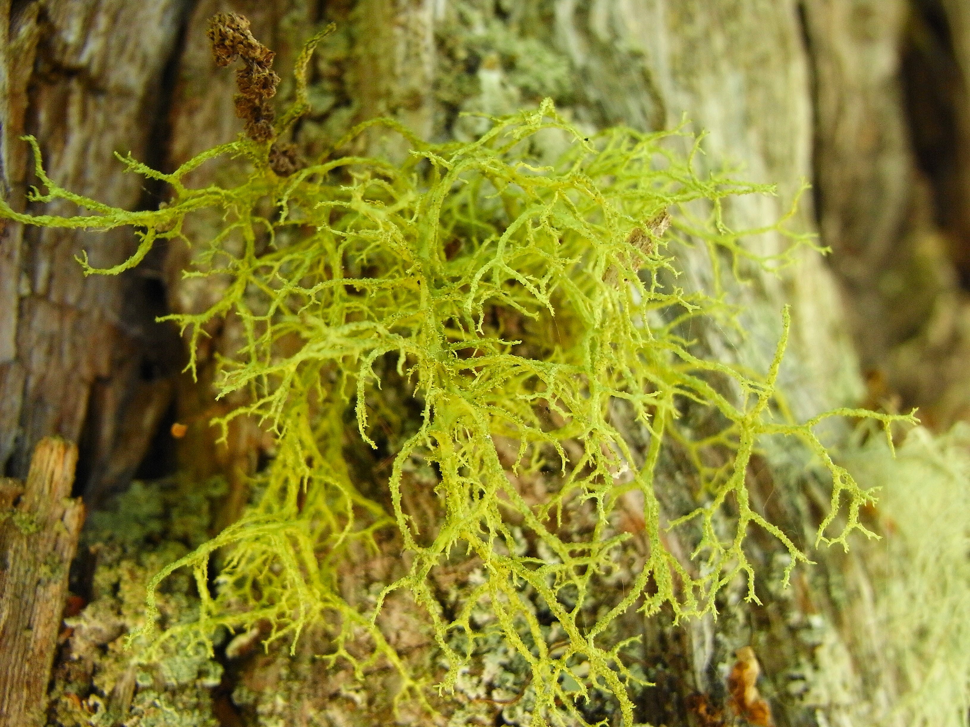 Como en otras ocasiones, visitamos el roble albar muerto, pero en pie, donde todavía crece Letharia vulpina, un liquen poco frecuente en nuestro territorio. Pronto descubrió el ser humano que este llamativo liquen fruticuloso, tóxico, podía ser utilizado para envenenar lobos y zorros, de ahí su nombre. Sus rápidos y enérgicos efectos, gracias al ácido vulpínico, son leyenda.