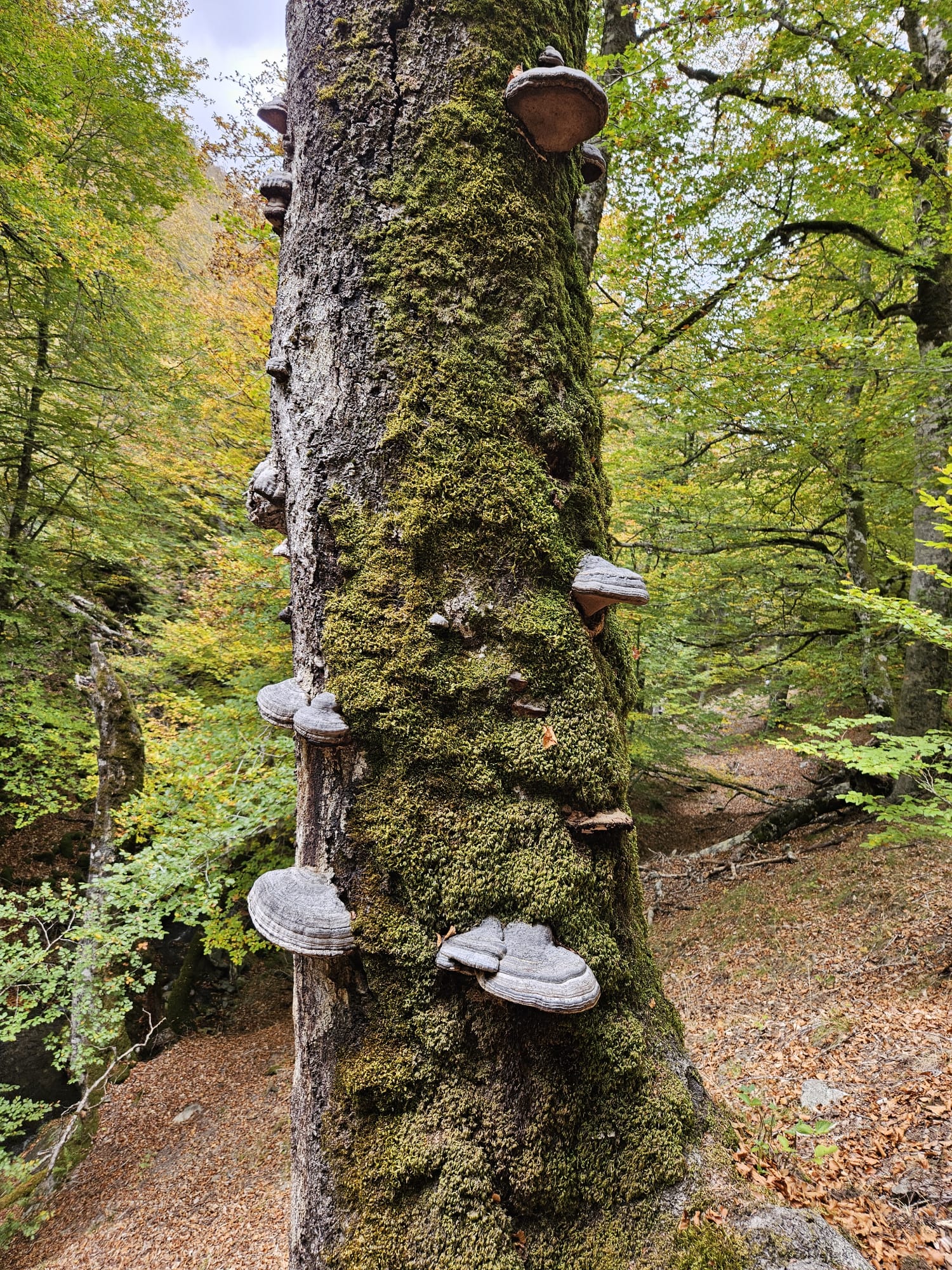 Tambien observamos Clitocybe nebularis. La pardilla gusta de hayedos sombríos con gran cantidad de hojarasca. En la Rioja la llaman también por esta razón «seta de hoja». En las zonas musgosas, que siempre conservan un poquito de humedad, aparece Hygrophoropsis aurantiaca.